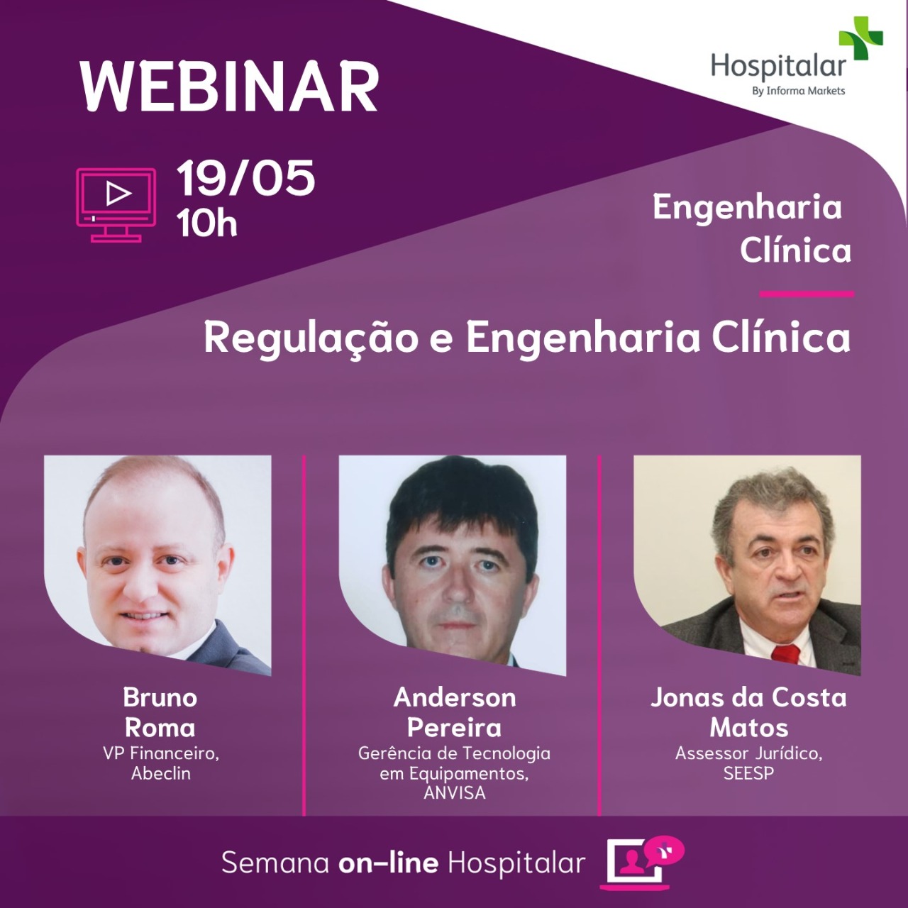 No dia 19 de maio de 2020 tivemos um webinar organizado pelas equipes da ABEClin e Feira Hospitalar que reuniu representantes da ANVISA, Sindicado dos Engenheiros no Estado de São Paulo e CONFEA.